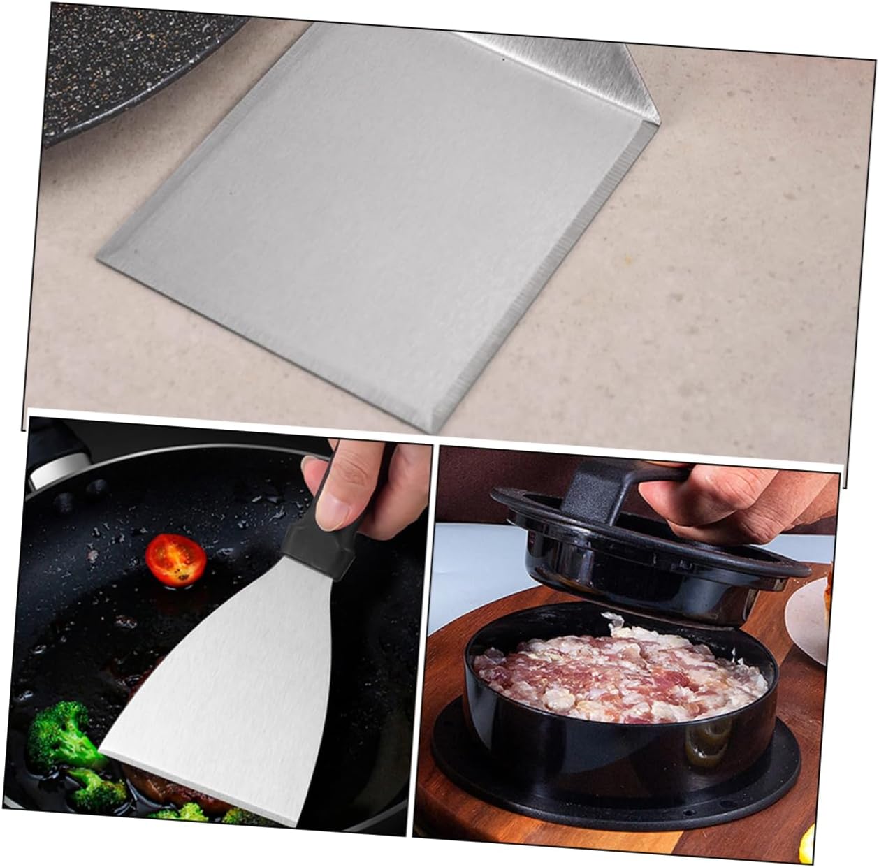 Package Include 1 x basking brush 1 x stainless steel meat press 1 x hamburger press 1 x cooking spatula (large) 1 x cooking spatula(small) 100 x paper liners 1 x 5-hole pepper shaker, 1 x single-hole pepper shaker Characteristics -Size:14.00X14.00X8.00cm/5.50X5.50X3.14in grill burger press -Material:Stainless steel, silicone burger press -Convenient storage: the tools are designed for easy to storage, allow you to keep them within reach while cooking grilling accessories -Strong construction: These tools are designed to withstand high temperatures and heavy use, ensuring durability and reliability butter brush -Comprehensive bbq set: this set includes essential tools for grilling, such as a burger press and spatula, etc., meet your needs well basting brush for cooking -Size:23.00X10.00X2.00cm/9.04X3.93X0.79in cooking tools -Color:Assorted Color baking brush -Multifunctional spatula: the spatula is designed for multiple uses, including flipping, frying, and serving, making it a versatile addition to your cooking needs butter brush for cooking -Practical to use: suitable for grilling burgers, steaks, vegetables, and more, versatile enough to handle a wide range of foods, making it ideal for bbq occasion kitchen brush for cooking -Size:31.50X13.00X8.00cm/12.38X5.11X3.14in food brushGoods Informationgrill spatula Whether you're camping, hosting a backyard BBQ, or enjoying a picnic, this BBQ tool set is a nice choice.grill burger press Ensures durability and longevity, while the ergonomic design provides comfort and ease of use.cooking tools The multi-functional spatula is nice for preparing a variety of dishes