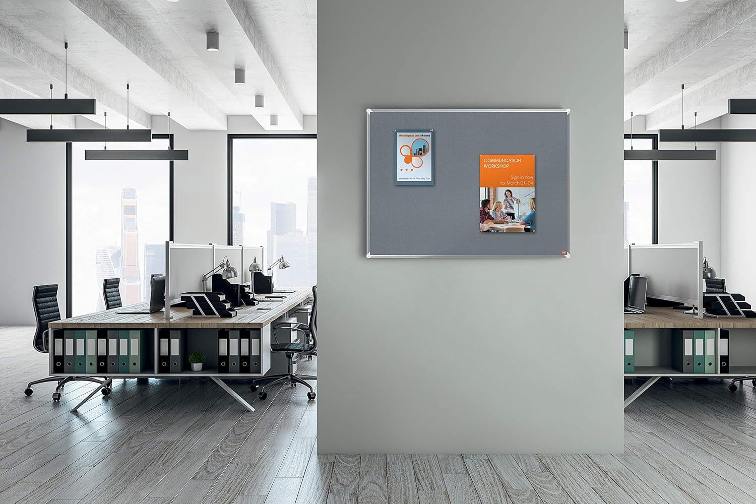 Excellent felt surface notice board to pin and display notices, Ideal for the office, home and school environment - The felt notice board surface is ideal for displaying printed notices or memos and the modern, stylish aluminium trim gives a premium look for the organisation of documents and notes - Easy to install and fixed by a traditional through corner wall mounting making it a Ideal fit for any room or home office environment - Mix and match with noticeboard accessories from the Nobo Range, 5 years guarantee - Contents: 1 x Nobo Premium Plus Felt Notice Board, Dimensions (H x W): 900 x 600 mm, Weight: 1.61 kg, Grey, 1915195