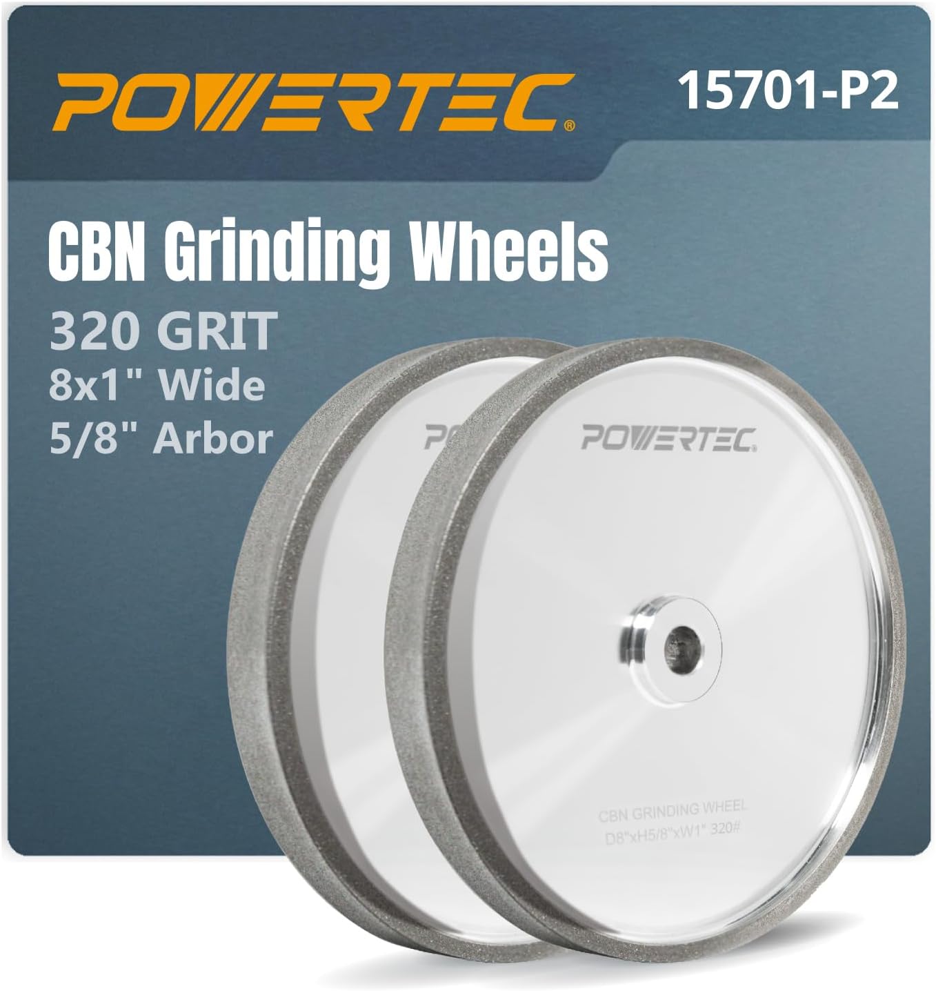 Introducing the Aluminum Oxide Grinding Wheel by POWERTEC. 100 Grit This 8” bench grinder wheel was designed to fit most stationary bench grinding machines for high speed steel sharpening and deburring. It features premium white aluminum oxide with a vitrified bond. As this abrasive grinds down with wear, it produces a consistent and fresh grinding surface for balanced work. Whether sharpening your metal lathe turning tools, lawnmower blades or other HSS tools – this grinding wheel stone will get the job done with high precision results. Commonly Used Applications • Lawn mower blade sharpening tool • Metal lathe tool sharpening • Sharpening HSS drill bits • Planer blade sharpener • Chisel sharpening tool (It is not recommended that you grind wood, plastic or any other non-metallic material on a bench or pedestal grinder.) Dimensions and Specifications Diameter: 8” Thickness: 1” Arbor size: 5/8” Material: White Aluminum Oxide (Alundum) Bond: Vitrified Grit Type: 100 Maximum RPM: 3600 POWERTEC is a leading manufacturer of high quality woodworking tools and accessories, machines, and an assortment of OEM replacement parts. We are committed to exceeding expectations, while bringing the latest innovations, technology, and product development to the industry.