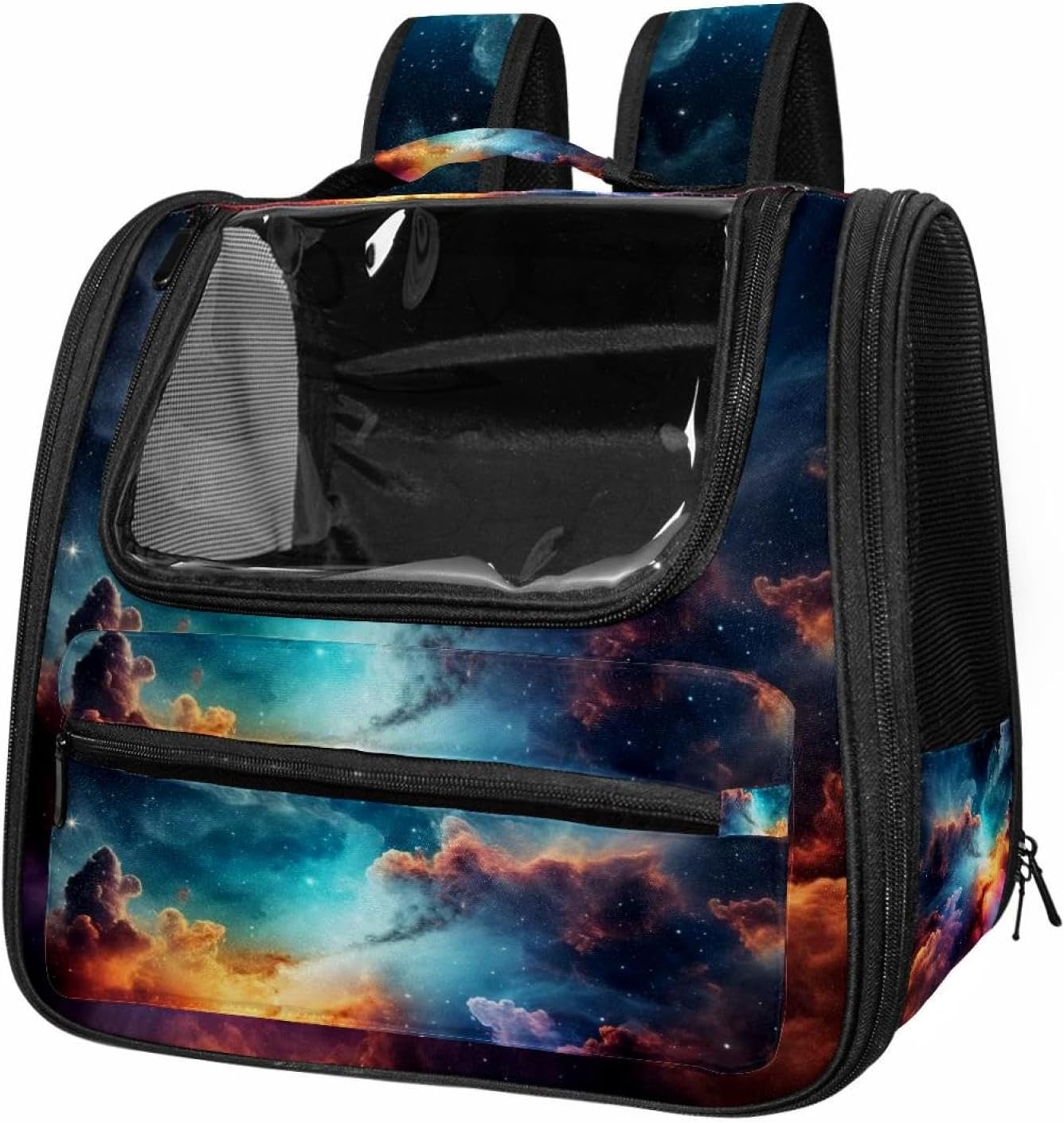 Well made: Cat Backpack Carrier is made from 900D oxford fabric, pp webbing, velvet, nylon, which is very sturdy, environmentally friendly and breathable. Not easily scratched by pet’s claws, pet backpack carrier is SAFETY & ANTI-SCRATCH. The back padding will give you a comfortable and breathable experience. Ventilated Backpack: With a breathable window in the front, this pet backpack allows cats to enjoy the sun without feeling stuffy. There are two side pockets and one big front pocket, and you can take foods or toy for your kitten pet. It is big enough for cat to turn around, and there are side pockets and hook holes, you will enjoy the greatest convenience when taking your cat out. Perfect size: Cat carrier is 15.75x9.84x13.78in/40x25x35cm. Fits most small/medium sized cat, dog, and pet. Quality fleece bed provide a comfortable place for your pet. Lightweight and easy to carry to all places. Built-in harnesses keep your naughty friends from escaping. Removable cosy mat for easier cleaning and let your pet enjoy it inside. Easy to carry: The adjustable shoulder strap of pet carrier bag help you hands-free carrying and makes it the most safe and convenient pet carrier bag for your travel. Seat belt design provide pets with safety protection throughout the trip. Pad protection keep your pets comfortable during travel. Unique Design: Innovative inside graphic design gives you a stereoscopic 3D visual experience. You also send us the photos you interest to make your unique dog or cat carrier. Pet bag is also a amazing gift for pet lover.